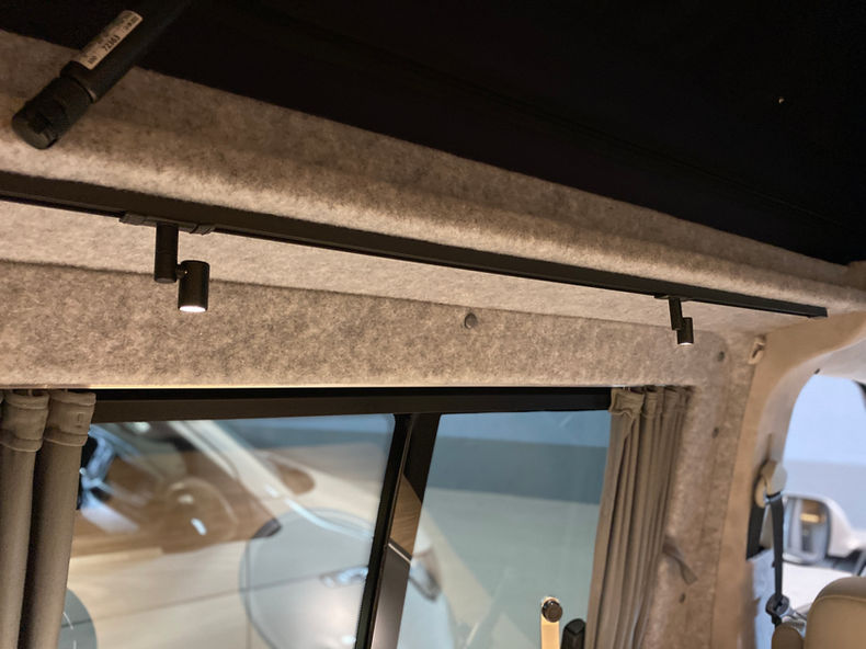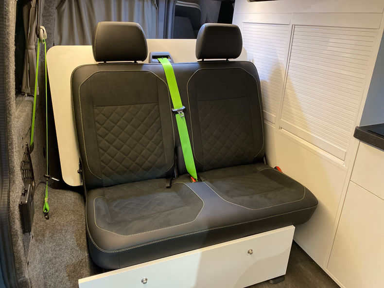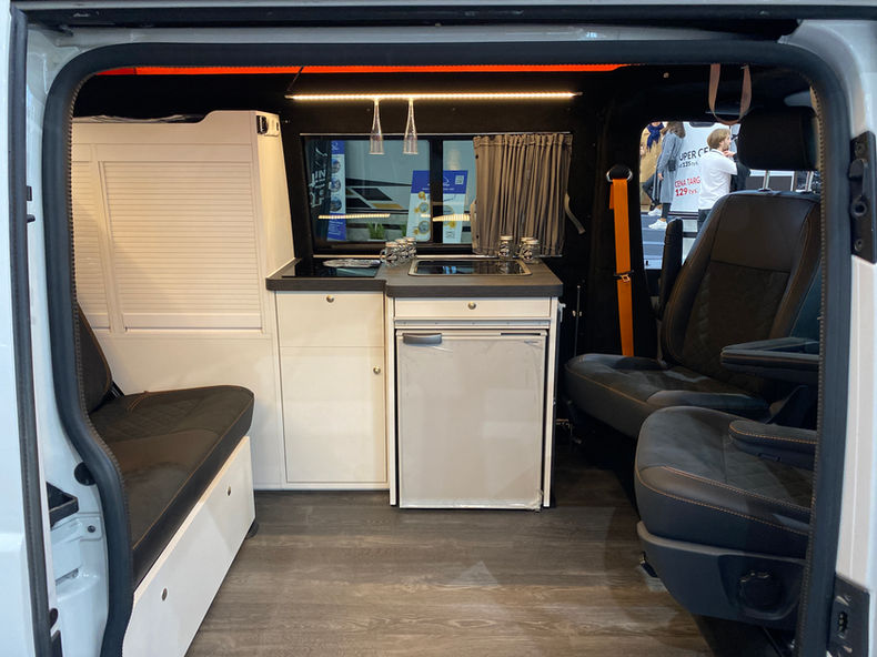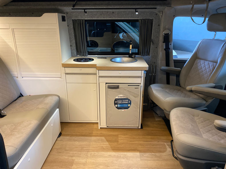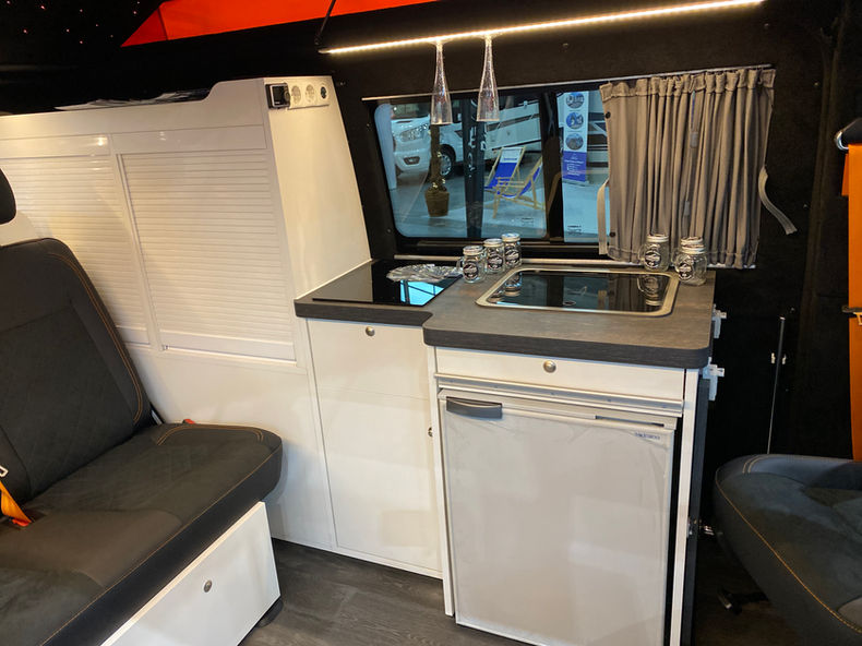 Um die Wasserversorgung kümmern sich zwei 12 Liter Behälter. Ein Gaskocher, ein Kühlschrank und die gesamte Bordelektronik werden in intelligenten Schranksystemen verbaut und bieten dennoch genügend Ablagemöglichkeiten und Staufächer für all die schönen und wichtigen Dinge, die man auf Reisen benötigt.